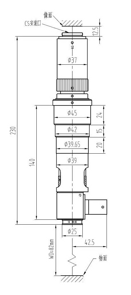 安裝尺寸:Φ45mm 最大兼容相機:1/2" CCD螺紋接口:1英吋32扣