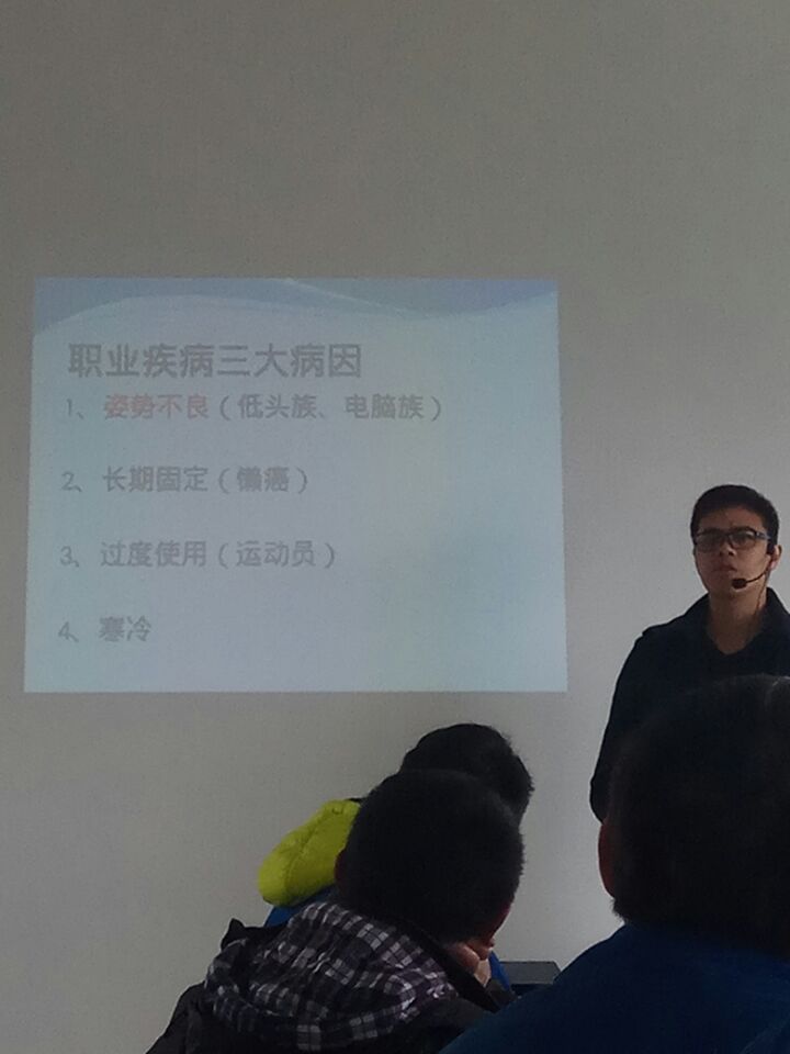 潘老師風趣幽默的講課讓培訓氣氛很愉快,員工們都聽得很認真,在培訓中學習到了不少健康知識,其中對于職業(yè)病的防治,尤其是肩部和腰部,與老師進行了很多互動。